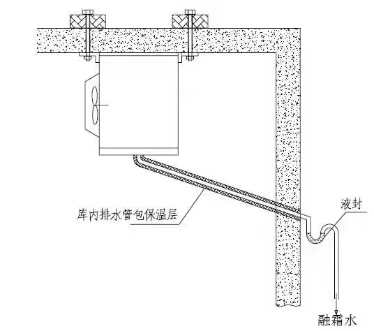 2、冷風(fēng)機(jī)的排水管道通往冷庫(kù)外應(yīng)有一定的坡度,使融霜水順利地排出庫(kù)外;