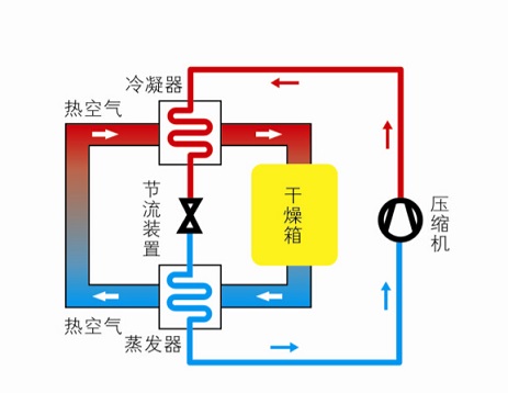 熱泵系統(tǒng)由壓縮機、冷凝器、節(jié)流裝置和蒸發(fā)器組成,系統(tǒng)內(nèi)運行的工質(zhì),在蒸發(fā)器中吸取干燥室排出濕熱空氣中的熱量,從低壓液態(tài)工質(zhì)蒸發(fā)成低壓蒸汽,經(jīng)壓縮機增壓成為高溫高壓的蒸汽;在冷凝器中,高溫高壓的工質(zhì)蒸汽放出熱量加熱進入干燥室的空氣,而工質(zhì)本身則從氣體冷凝成高壓液體;通過節(jié)流裝置,液體工質(zhì)產(chǎn)生阻塞效應(yīng),降低了壓力和溫度,成為低壓低溫液體,再度進入蒸發(fā)器中吸收濕熱氣體的熱量,如此反復(fù)循環(huán)將低溫熱量輸送到高溫介質(zhì)中去,形成熱泵循環(huán)。
